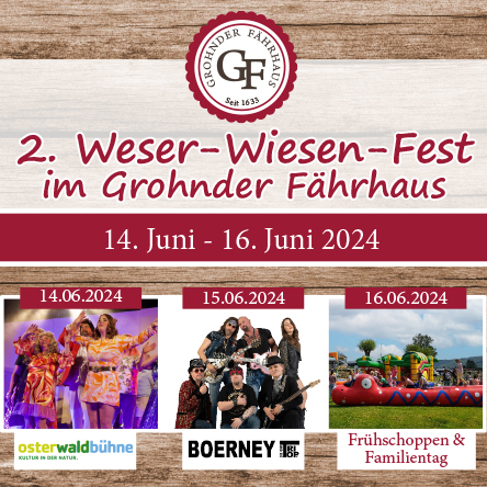 Liebe Gäste, aufgrund unseres 3-tägigen Weser-Wiesen-Festes (14.06.2024-16.06.2024) am Grohnder Fährhaus bleibt unser Biergarten auf dem Werder geschlossen.